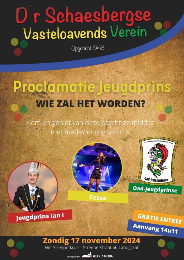 Zondag 17 november 2024 is in het Streeperkruis te Landgraaf Kay Rohan geproclameerd tot Jeugdprins Kay I van Groeët Schaesberg. Na de abdicatie van...